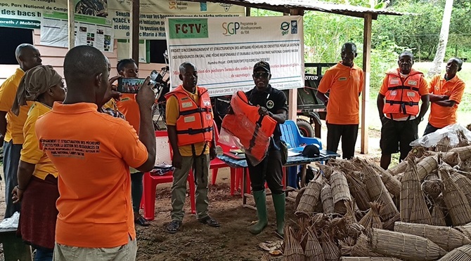 FCTV a une longue expérience en matière de fabrication de gilets artisanaux de sauvetage. L’organisation en fait profiter aux communautés riveraines des cours d’eau comme celle de Mabiogo à Campo au bord du Ntem.